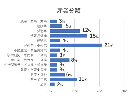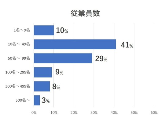 従業員数9名以下の小規模企業が10%、10名~99名の中小企業が70%、100名~499名の中堅企業が17%、500名以上の大企業が3%です。従業員数50人以下の小規模事業者・中小企業が8割です。