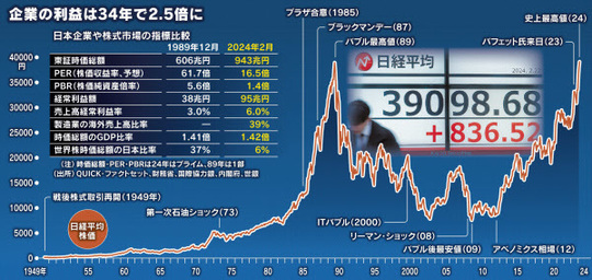 東京株式市場では22日、日経平均株価が前日比836円52銭(2.2%)高の3万9098円68銭で終え、34年ぶりに最高値を更新した。生成AI(人工知能)への期待が半導体関連にマネーを呼び込んだ。株高の底流には日本企業が守りから攻めの経営に転じ、海外投資家が評価する動きがある。株高の恩恵は家計に行き渡らず、賃上げを起点とした好循環実現に課題が残る。