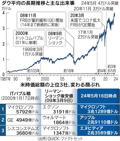 米国の代表的な株価指数、ダウ工業株30種平均が17日、終値として初めて4万ドルの大台を突破した。リーマン危機翌年の2009年3月に付けた安値6547ドルから指数は15年で6倍超に拡大した。米国企業の合計時価総額は世界の半分近くを占める。イノベーション(技術革新)とけん引役の新陳代謝が、株価の持続的成長につながっている。