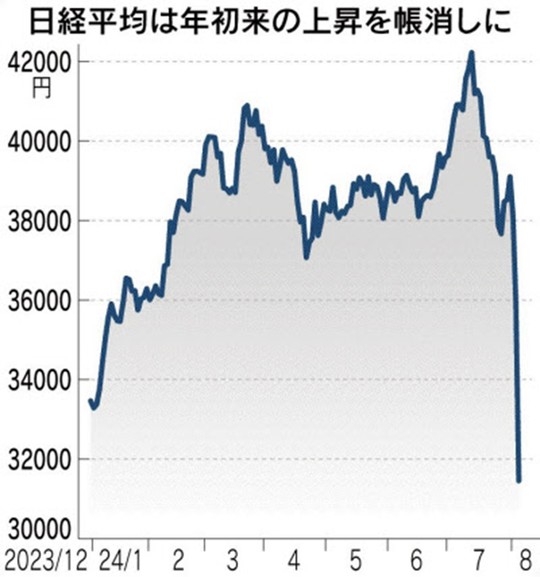 5日の日経平均の終値は前週末比4451円28銭(12.4%)安の3万1458円42銭だった。日経平均は月初からの3営業日で計7643円(19.5%)安、3日間の下げとしては幅と率ともに過去最大の急落になった。2023年10月末以来約9カ月ぶりの水準に沈んだ。7月11日につけた史上最高値(4万2224円)から1カ月弱で下げ幅が1万円を超す記録的な急落だ。
