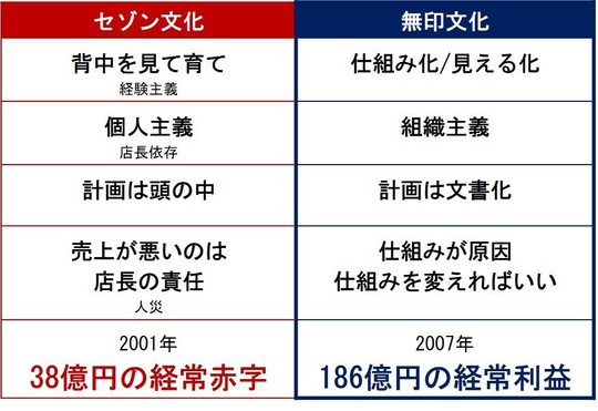 例えば、無印良品が38億円の赤字から、僅か6年で186億円の黒字に転換できた理由は「企業文化」を変えたことにあるといわれています。