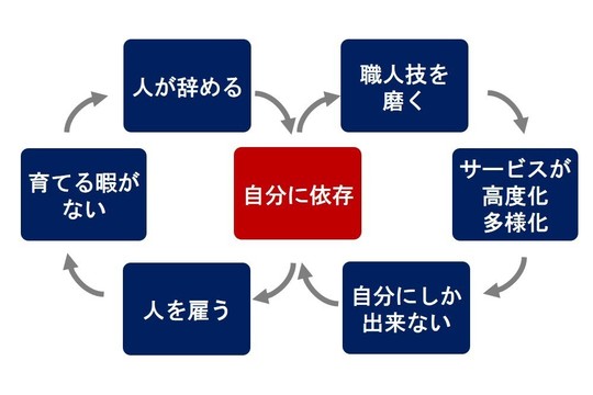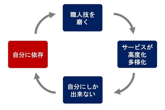 経営者(オーナー)が多様なサービスを高いレベルで提供することに注力することで、事業が複雑化します。この複雑さが、他の従業員や外部の支援者にとって理解しにくくなり、オーナー自身が事業の中心人物であり続ける状況を生み出します。