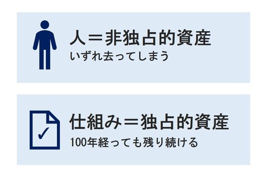| 会社の資産は・・・ | 人材 (人は会社がコントロールできるものではなく、転職・独立は個人の自由。人材は非独占的で、いつかは辞める) | 仕組み (人が仕組みを創り、仕組みが会社を動かす。仕組みは独占的資産で100年後も残る) |