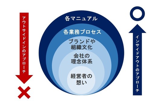 仕組み化に取り組む際、一般的には業務のマニュアル化や仕組み化に取り組む際、一般的には業務のマニュアル化やルール作りから始めがちですが、正しいアプローチは異なります。まず、経営者のビジョンに基づく明確な理念を確立し、それを具現化する仕組みを構築することが肝要です。
