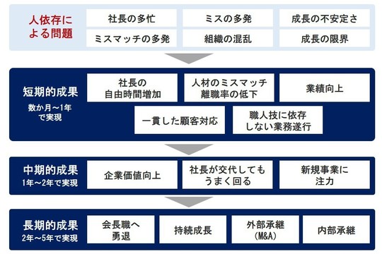 「人依存」の経営では、成長と永続性に限界があります。そこで、私たちの提案する解決策は、経営の視点を変え、会社を「人依存」から「仕組み依存」へと変えていくことです。