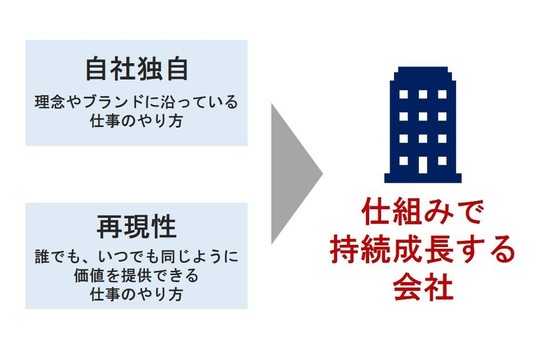 仕組みとは、自社独自の再現性のある仕事のやり方のことです。仕組みがあることで、業務の効率化が進み、社員はより価値ある業務に集中することができ、やりがいや成長機会が増えることも期待できます。