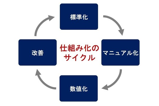 仕組み化は、マニュアル化や標準化、数値化、改善が相まって実現できます。以下の図が仕組み化のサイクルであり、これを回していくことで会社が仕組みで成長していくことになります。