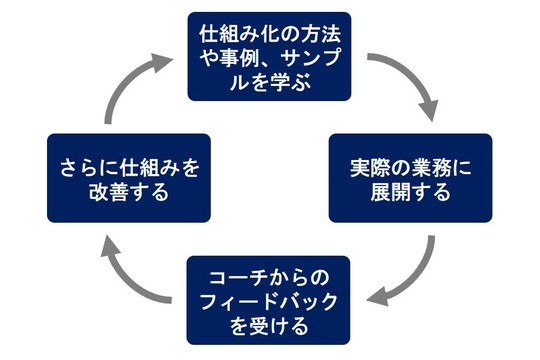 ご提供する様々なカリキュラムを学び、実践し、コンサルタント(コーチ)からのフィードバックを受けることで、御社の仕組みづくりを確実に進めていきます。