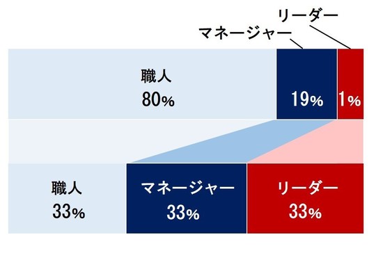 年商が1億~3億円ぐらいの会社の社長の場合、職人として現場で働いている時間が80%、1年目線のマネジメント業務が19%、未来を考えるリーダーの仕事が1%の割合になっているケースが多いです。