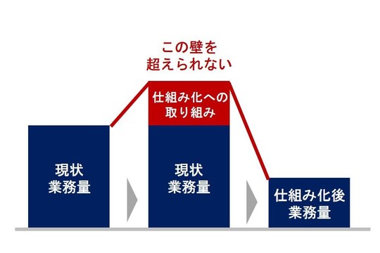 社員が忙しく働いている中で、仕組み化により効率化したいと考えます。しかし、現状業務の上に、さらに仕組み化のための活動が入ると、時間が足りなくなります。やる気はあっても何も仕組み化が進まないということもあります。「他社でやっているから良さそうに見える仕組み」を入れようとしては、いくら時間があっても足りません。