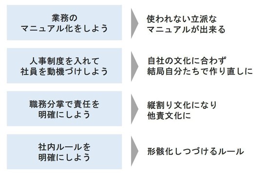 マニュアル化や人事制度、ルール作り等、どれもコンサル会社に数百万円を払えばやってくれます。しかし、考えているほど簡単に成功するなら、だれも経営に苦労はしません。