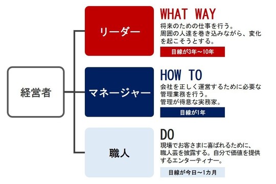 中小企業の経営者(オーナー)は、「職人」「マネージャー」「リーダー」という全く性質と役割の違う3つの仕事を一人でこなさなければなりません。