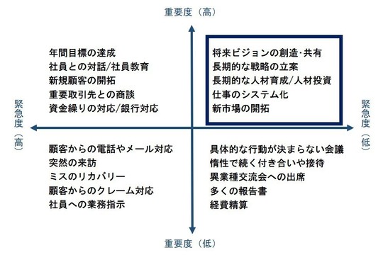 これらの結果、経営者(オーナー)は、「重要度」が高いにもかかわらず「緊急度」が低い業務(経営者の本来業務)を後ろ倒しにしてしまいます。